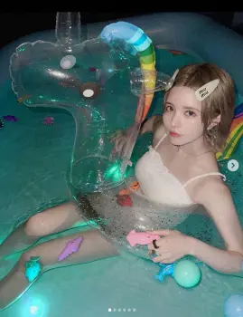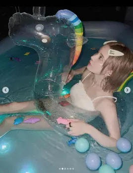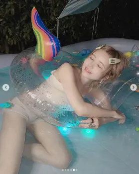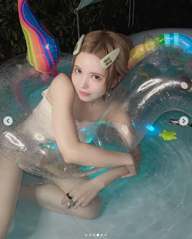 「浮き輪あると痛くない プール入れて嬉しかったー ちなみに骨折してなくても普段からまったく泳げません。笑 みんなはこの夏海とかプール入った?」とつづり、自宅でナイトプールを楽しんでいる写真をアップした。