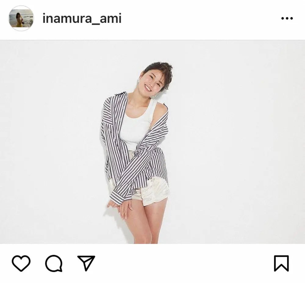 稲村は白のタンクトップ&ショートパンツ、ストライプのシャツを羽織った笑顔の写真を披露し、「26歳になってまた短パンが好きになりました」と意外な告白。「夏も終わるというのに三着かいました」と明かした。