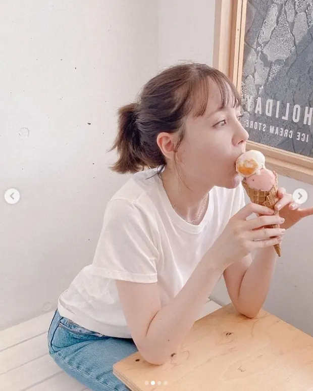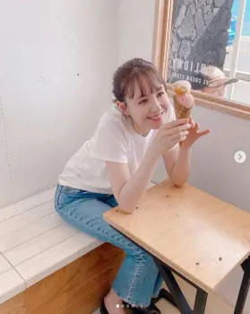 「アイス、おいしそうでしょ?とある撮影のオフショットなのですが、写真選びや構成に私も参加していて、みなさんに喜んでもらえるかなぁ?とがんばってます!」とつづり、白いTシャツ、デニム、ローファー姿でアイスクリームにパクついている写真をアップした。