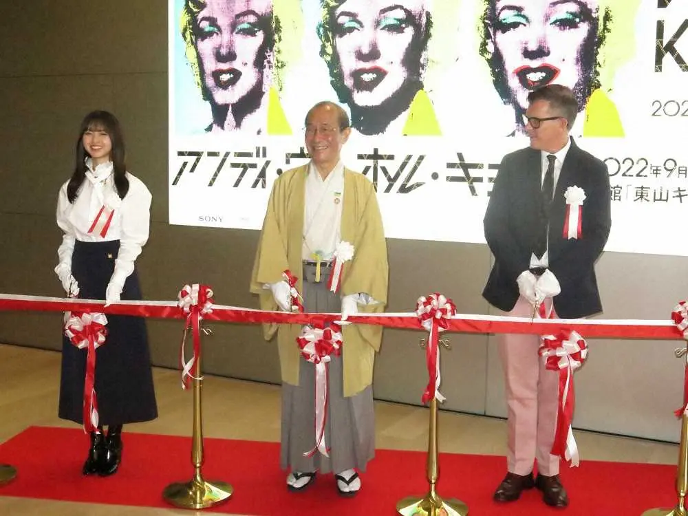 「アンディ・ウォーホル・キョウト」の開会式でテープカットした(左から)乃木坂46・齋藤飛鳥、門川大作京都市長、アンディ・ウォーホル美術館館長のパトリック・ムーア氏