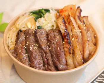 スペシャル弁当は税込み1500円で限定100食。店の人気メニューのハラミと霜降り豚トロに、もやしナムル、小松菜ナムル、キムチ、味つきネギをトッピングする。