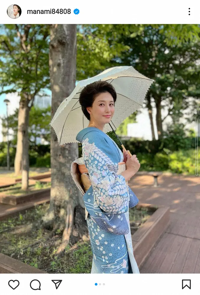 「ドラマ特区 #恋と弾丸 #10月27日放送スタート 高級クラブ兼小料理屋のママ役で出演します」と書き出すと、水色の着物に日傘をさしたショットなどをアップ。「聞き上手で、みんなの良き相談相手。大好きなお着物で登場します 来月からです。お楽しみに #MBS」とつづった。