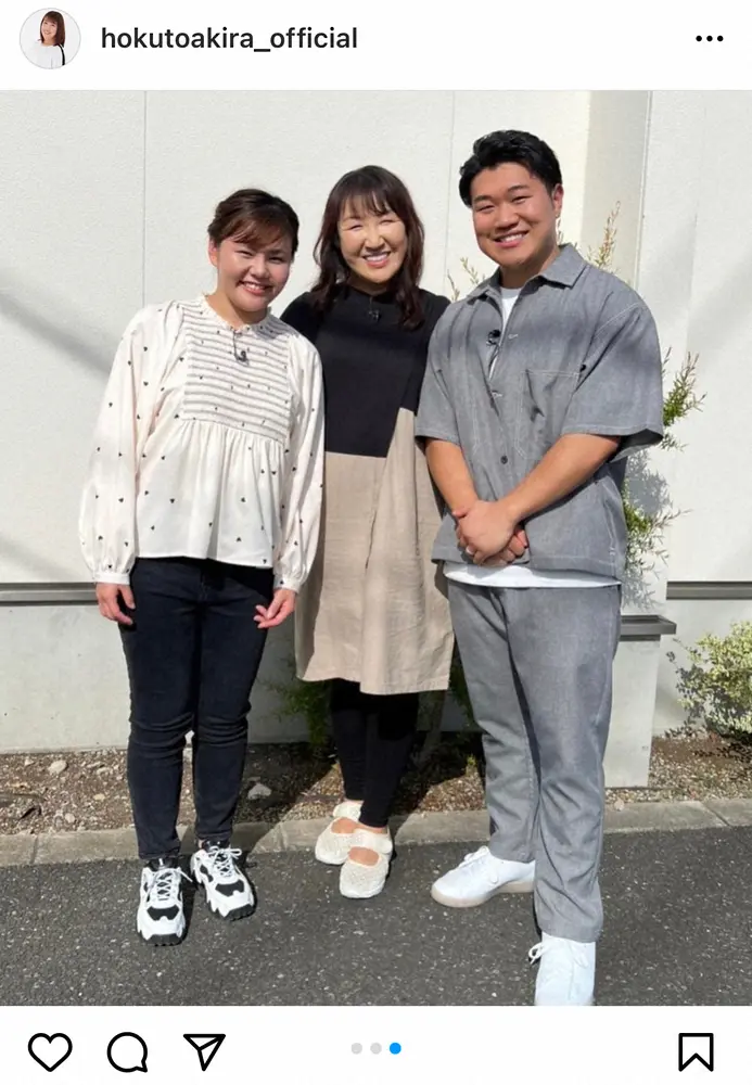 北斗は「昨日のロケは、家族ででした」とつづり、長男・佐々木健之介さんとプロレスラーの門倉凛の夫婦写真をアップ。「とにかく、可愛い笑顔の2人2人 人の笑顔がこんなに周りの人間を幸せにするんだとな~と2人を見ていて思う」とつづった。