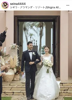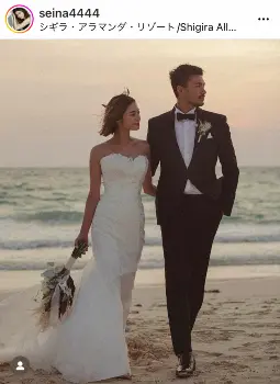 ハッシュタグで「#シギラセブンマイルズリゾート」「#シギラリゾート」「#利ぞーどウェディング」「#沖縄ウェディング」「#アラマンダチャペル」「#リゾ婚」「#宮古島」「#せなのあウェディング」と添え、美しいウェディングショットを披露した。