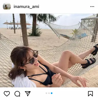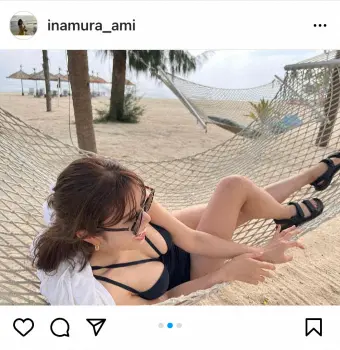 「夏休み満喫しました」と海辺でのひとときを公開。サングラスに黒の水着でハンモックに揺られ「毎日朝日をみて22時にはねる生活でした」と報告。「最終日のボディーボードはとても楽しかったです #いなむらの夏休み」とつづった。