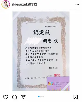 鈴木は「この度、ACE認定チャイルドマインダーの資格を無事取得することができました」と報告。「以前から、子供の心の成長や発達について興味があったのですが 親になったことや、すくすく子育ての番組を通して、よりその興味が自分の中で強いものになっていきました しかし日々の子育ては悩むこともたくさん。そんな中、私自身も“1人の親”として救われるような気持ちで毎回の授業を受けていました」と明かした。