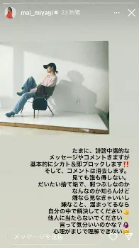 ストーリーズを投稿し、「たまに、誹謗中傷的なメッセージやコメントきますが 基本的にシカト&即ブロックします!! そして、コメントは消去します」と宮城。「見ても誰も得しない。だいたい捨て垢で、暇つぶしなのかなんなのか知らんけど 嫌なら見なきゃいいし 嫌なこと、溜まってるなら 自分の中で解決してください 他人に当たらないでください」と誹謗中傷コメントへの怒りをぶちまけた。