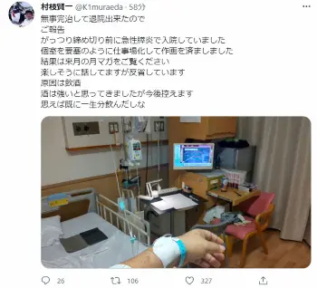 村枝氏は「無事完治して退院出来たのでご報告」とし「がっつり締め切り前に急性膵炎で入院していました」と報告。また「個室を要塞のように仕事場化して作画を済ましました」と点滴をしながらも病室に漫画を描くための道具持ち込んでいる写真も投稿した。