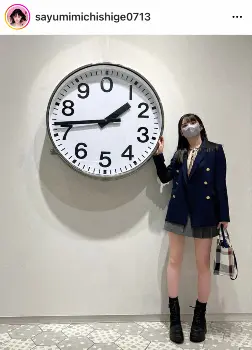 紺のジャケット、ベージュのトップス、グレーの超ミニスカート、黒のブール、チェックのバッグというスタイルで、「一応、矢沢あいさんの漫画の世界観意識の格好です。外での写真と、時計とのツーショット」と説明した。