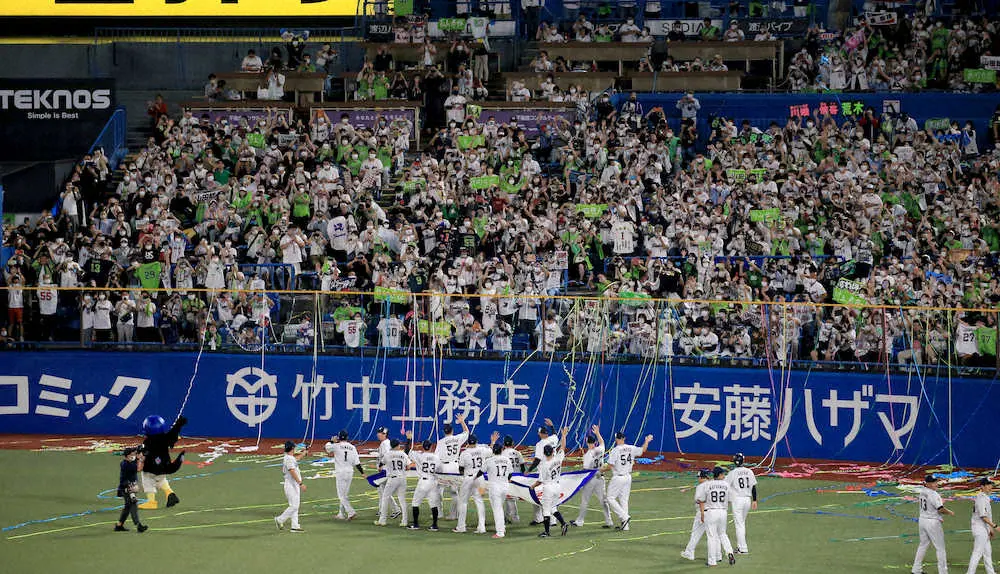 場内一周をするヤクルトの選手らを祝福するライトスタンドのファン(撮影・篠原岳夫)