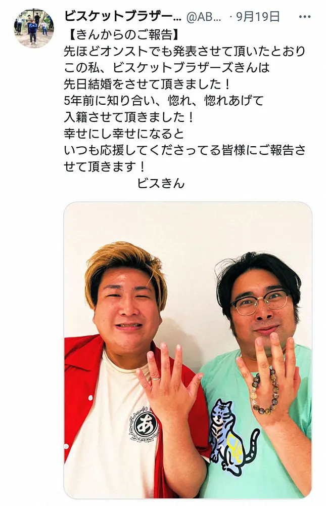 ビスケットブラザーズ・きん 幸せいっぱい TVでも結婚生報告「色でいうとバラ色の方で」