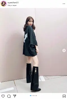 「たまにこんな日も お気に入りの@givenchyのブーツ ミニスカと合わせたい Tシャツは忘れた頃に届いた#yeezygapbalenciaga」と添え、バレンシアガのオーバーサイズTシャツにジバンシィのブーツを履いたオールブラックのコーディネートをアップした。