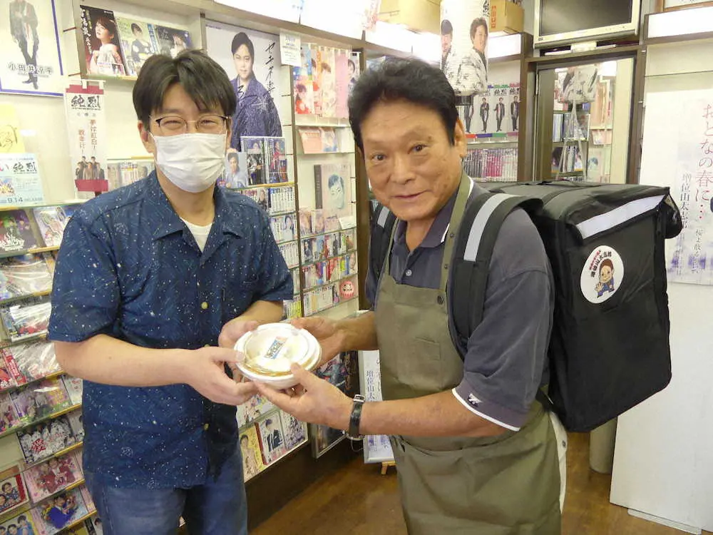 元大関の演歌歌手・増位山太志郎がちゃんこ鍋をレコード店に差し入れ 配達用リュックで“マースーイーツ”