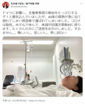 たかまつななツイッター(@nanatakamatsu)から たかまつなな 滞在先のドイツで40度の高熱で救急搬送 コロナ陰性も「悔… ギャラリーで見る この記事のフォト 2022年09月29日の画像一覧 もっと見る 2022年09月29日の画像をもっと見る