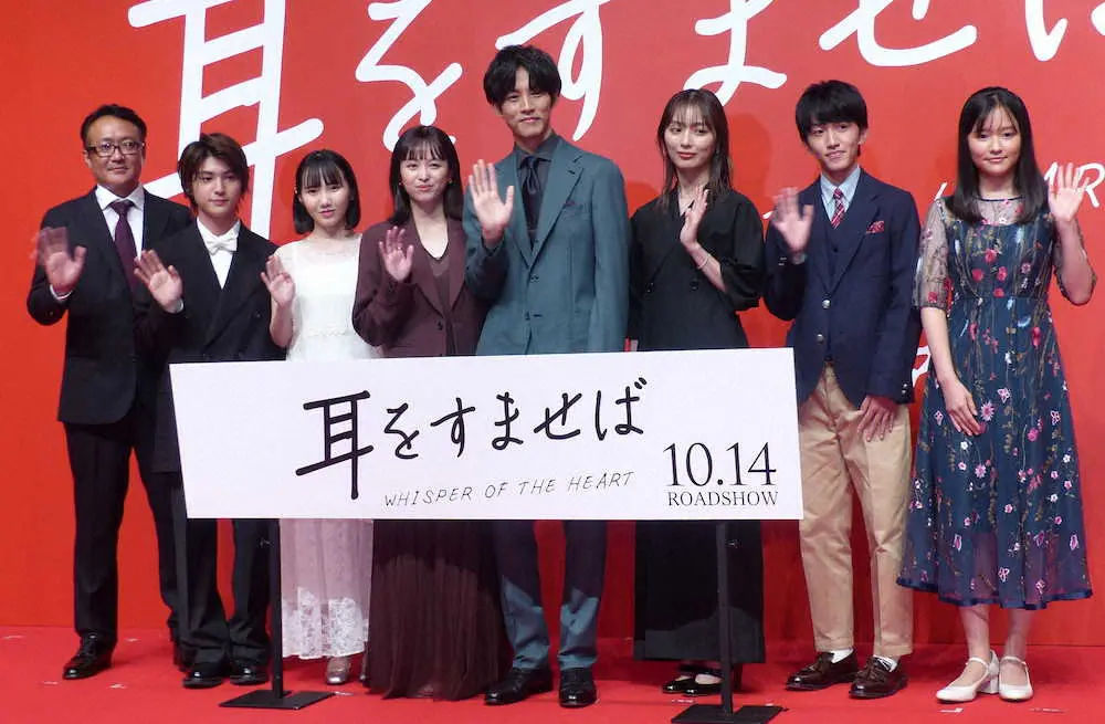 映画「耳をすませば」ジャパンプレミアイベントに登壇した(左から)平川監督、荒木飛羽、安原琉那、清野菜名、松坂桃李、内田理央、中川翼、住友沙来