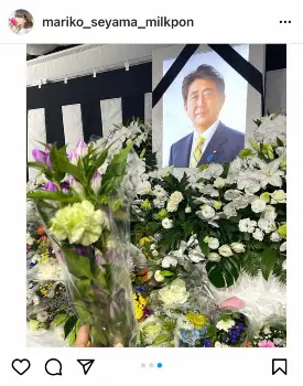 黒の服に花を持つ写真や献花台の写真などを添え、「安倍元総理、日本のために尽くして下さり、ありがとうございました。これからも、空から日本国を見守って下さい」と記した。