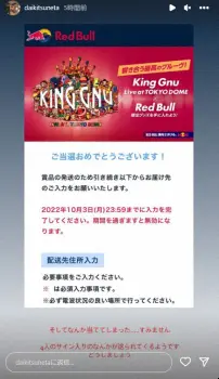 エナジードリンク「Red Bull」とのコラボ企画で、「King Gnu」4人の限定グッズが当たる懸賞に当選したことを報告。「ご当選おめでとうございます!」と当選通知の画像とともに「なんか当ててしまった…すみません 4人のサイン入りのなんかが送られてくるようです どうしましょう」とメッセージを添えた。