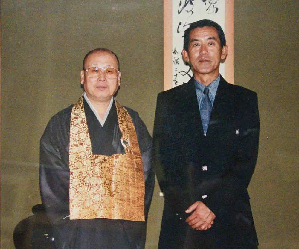 群馬・前橋市の釈迦尊寺住職、山崎奎一さん(左)と三遊亭円楽さん