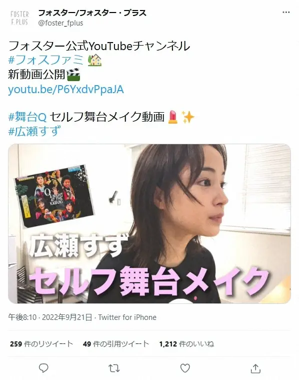 「【楽屋トーク】本番前に、メイクしながら喋りました!【広瀬すず】」というタイトルで投稿された動画。「『Q』:A Night At The Kabuki 」(作・演出 野田秀樹)で自身が務める「源の愁里愛」のメイクを撮影するという。