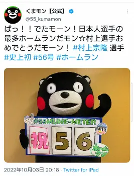 直後に「くまモン」は公式ツイッターで「ばっ!!でたモーン!日本人選手の最多ホームランだモン☆村上選手おめでとうだモーン!」と祝福し、「#55MUNE-METER 祝56ホームラン」と書かれたボードを持ってガッツポーズした写真を投稿した。