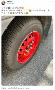 その後、同日昼にも「タイヤパンクした」とタイヤの写真もアップ。「ディーラーさんお休みだった JAFさんがタイヤ貸してくれた ありがたや~」と何とかトラブルを切り抜けたことを明かした。