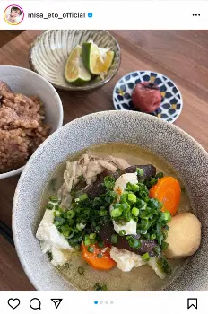 さらに、別投稿では「さっそく食欲の秋~豚汁が美味しい季節になってきました。今日はお友達がお家まで来てくれたので久しぶりに作りました!豚汁って、皆さん何と読みますか?我が家はぶたじるです。北海道と九州の一部で呼ばれるらしいけどどうなんだろう…」とし、豚汁に大分から届いたかぼすを絞る食べ方を披露した。