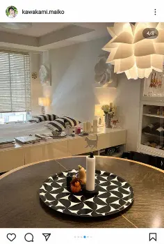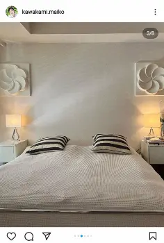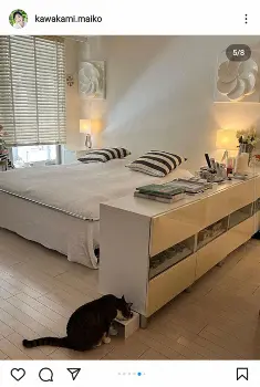 川上は「谷根千エリアと呼ばれる下町の1LDKのマンションで日々を過ごしています」とし、その「お店やサロンがあるこの町が生活の拠点となり、マンションには、ほぼ寝に帰るだけなため、インテリアもホテル形式としました。リビングの主役は20代で奮発した、スウェーデンのデザイナー、ブルーノマットソンのベッド」と説明。スウェーデン出身の川上は、車も同国の自動車メーカー「サーブ」を乗り継いでいる。
