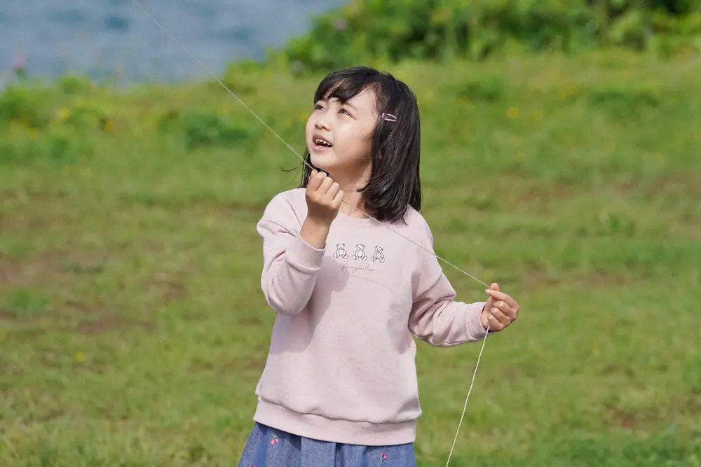 連続テレビ小説「舞いあがれ!」第1週は「ばらもん凧、あがれ!」。魚ヶ崎公園にて。ばらもん凧を揚げる舞(浅田芭路)(C)NHK