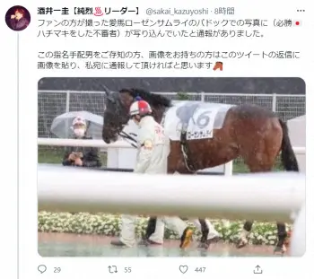 酒井は「ファンの方が撮った愛馬ローゼンサムライのパドックでの写真に(必勝 ハチマキをした不審者)が写り込んでいたと通報がありました」とつづり、酒井が初めて所有した競走馬のローゼンサムライ(牡2=大井・坂井、父リーチザクラウン)が7日、大井5R・2歳新馬(ダート1200メートル)でデビューしたときの写真をアップ。「この指名手配男をご存知の方、画像をお持ちの方はこのツイートの返信に画像を貼り、私宛に通報して頂ければと思います」と呼びかけた。