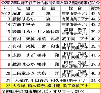 2012年以降の紅白歌合戦司会者と第2部視聴率(%) Photo by スポニチ 橋本環奈 紅白司会にサプライズ起用 初大役に「ただただ驚き」 ギャラリーで見る この記事のフォト 2022年10月11日の画像一覧 もっと見る 2022年10月11日の画像をもっと見る