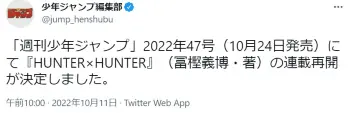 冨樫義博氏の大人気漫画「HUNTER×HUNTER」が、10月24日発売の週刊少年ジャンプ(集英社)47号で連載を再開することが分かった。少年ジャンプ編集部の公式ツイッターで発表された。同作品は、18年11月26日発売の週刊少年ジャンプ52号に掲載された390話を最後に、3年以上休載していた。