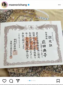 モデルの前田典子(56)が11日までに自身のインスタグラムを更新。日本和装協会の和装師範の認定証が届いたことを報告した。
