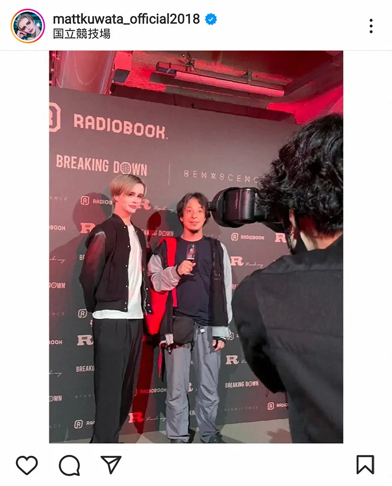 Mattは「ひろゆきさん はじめまして」と記し、今月5日に東京・国立競技場で開かれたイベント「RADIOBOOK RECEPTION」で撮影した2ショットを披露。「breakingdown」「radiobook」とタグを添えた。