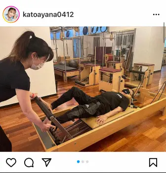 綾菜は「カトちゃんがピラティス始めました」と報告。「私が9ヶ月通い身体が変わったのがわかり話すとカトちゃんもやってみる事に 自分の身体に向き合えて凄く楽しいみたいで趣味がまた一つ出来ました」と明かした。