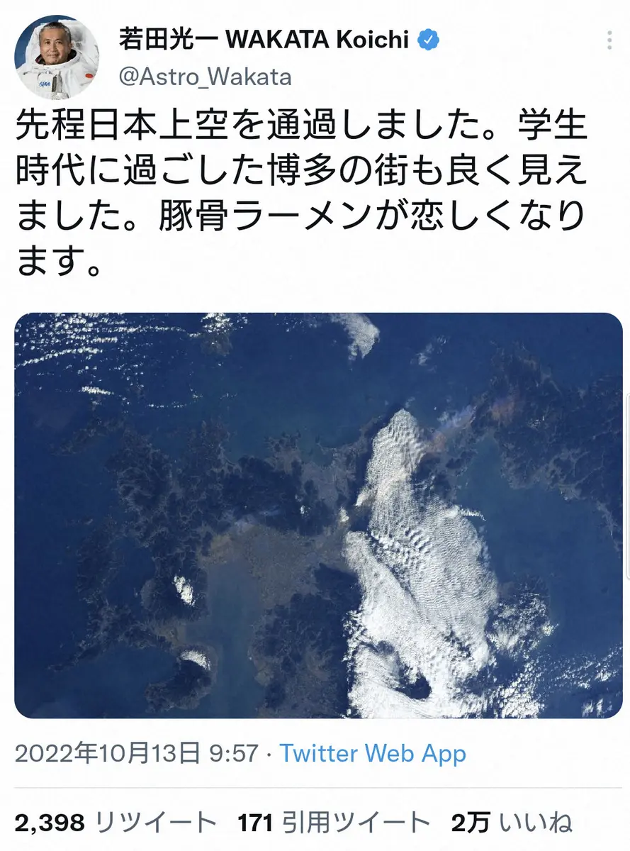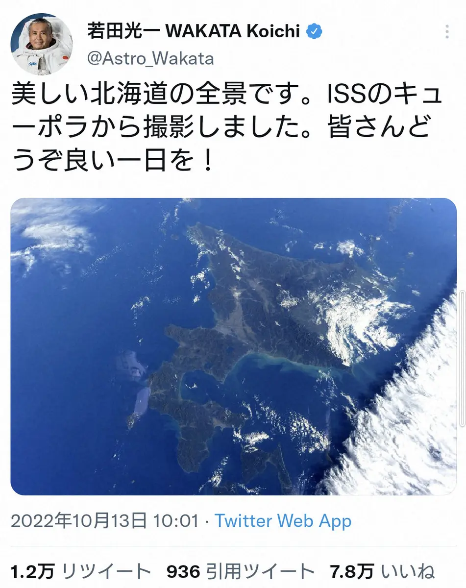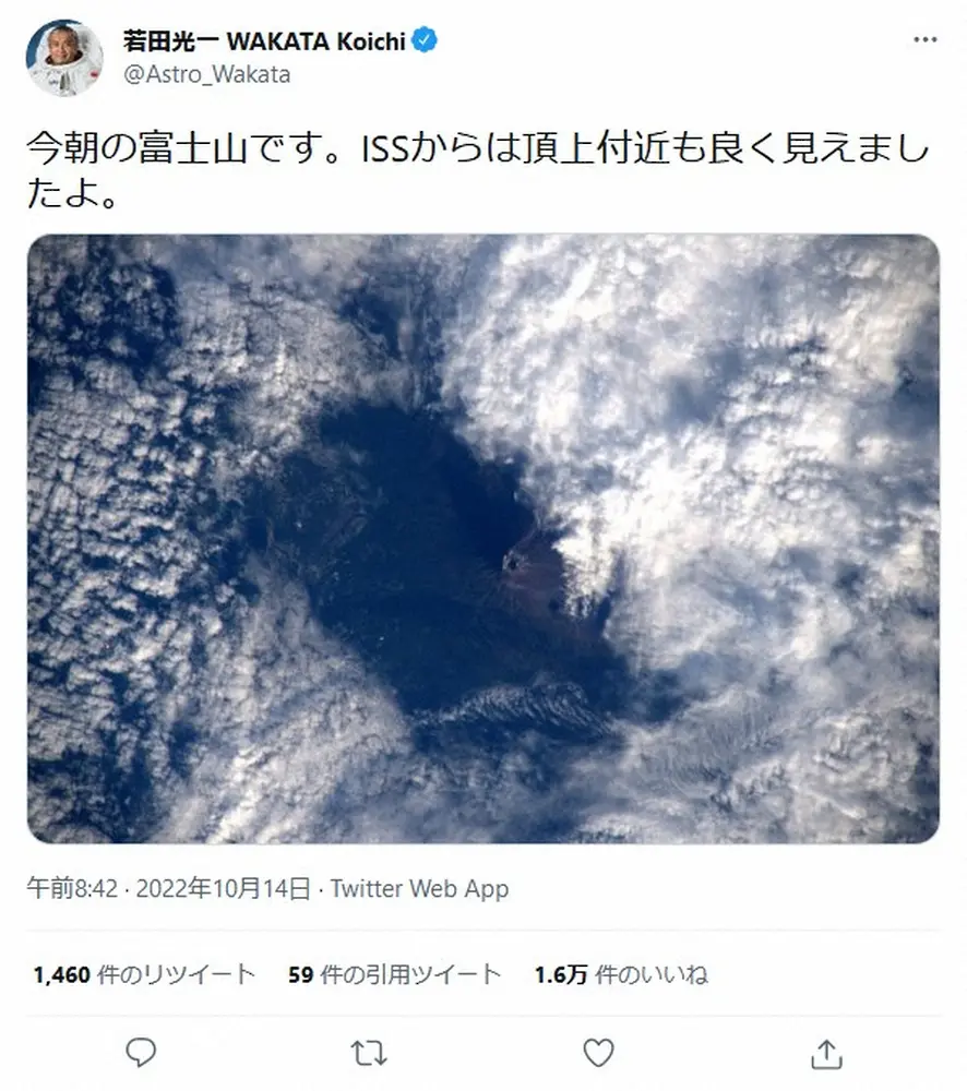若田光一氏の公式ツイッター(@Astro_Wakata)から 宇宙飛行士・若田光一氏 宇宙から連日の“お便り”「今朝の富士山です」「… ギャラリーで見る この記事のフォト 2022年10月14日の画像一覧 もっと見る 2022年10月14日の画像をもっと見る