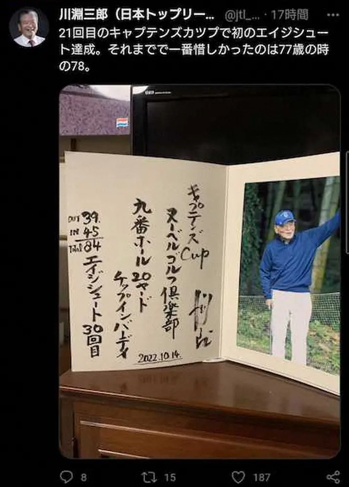 川淵氏は「21回目のキャプテンズカツプで初のエイジシュート達成。それまでで一番惜しかったのは77歳の時の78」と投稿。添えられた写真によると、川淵氏はOUTを39、INを45で回り、年齢より1つ少ない84でホールアウトした。