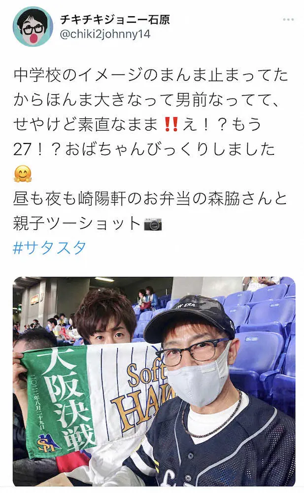 熱烈なオリックスファンの石原はCS中も連日、現地観戦。前日14日に京セラドーム大阪で行われたファイナルステージ第3戦に一緒に訪れたソフトバンクのユニホームを着用する鷹党・森脇と、長男・倖平(こうへい)さんの写真を投稿した。