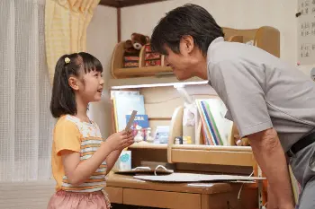 連続テレビ小説「舞いあがれ!」 第12話。舞の部屋にて。岩倉舞(浅田芭路・左)にある写真を見せる岩倉浩太(高橋克典)(C)NHK