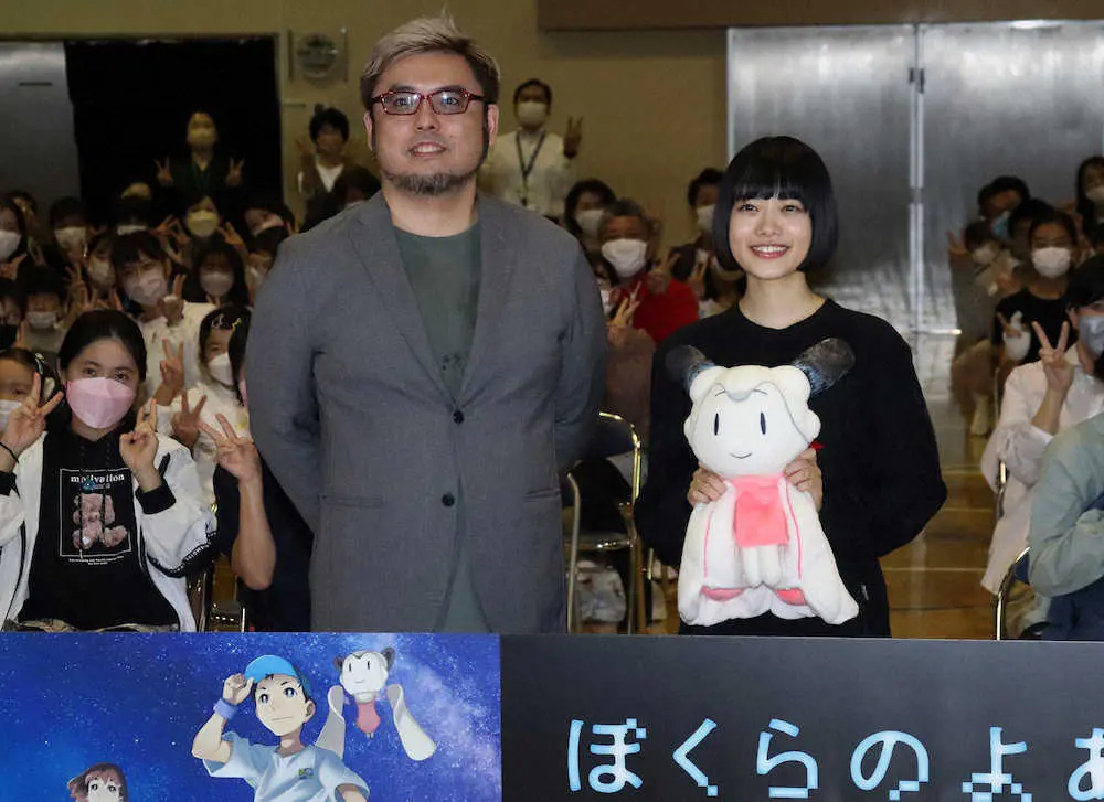 映画の舞台のモデルとなった小学校で、杉咲は「下駄箱とかは想像していた以上に小さくて、小学生の時に見ていた世界を思い出してニコニコしてしまった」と笑顔。地球に飛来した「ある存在」を宇宙に帰そうとする主人公の小学4年生の声優を務め「宇宙へのつながりが感じられる夢のある物語。大切な存在を改めて考え直す気持ちになってほしい」と呼びかけた。