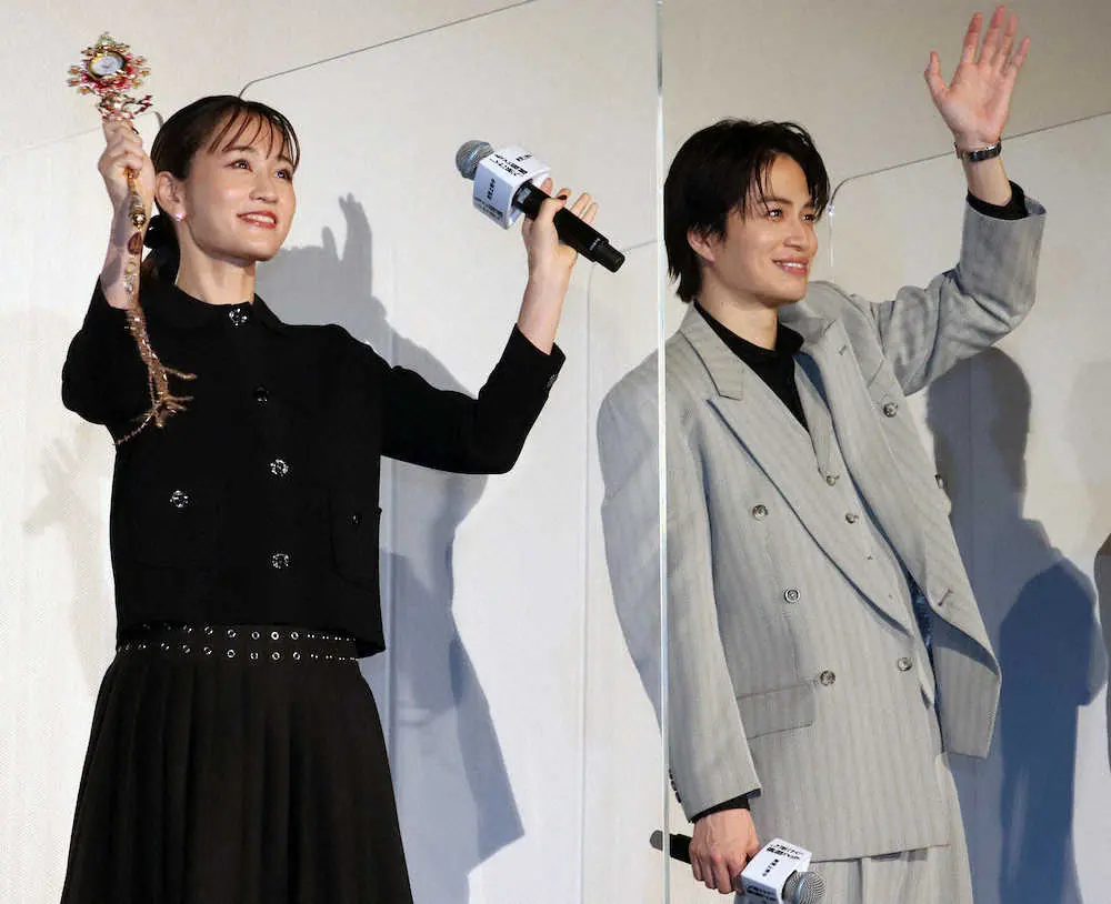 映画「もっと超越した所へ。」の公開記念舞台あいさつで、ファンに手を振る前田敦子(左)と菊池風磨