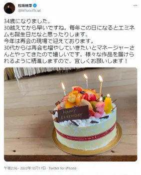 俳優の松坂桃李が17日、自身のツイッターで34歳の誕生日を迎えたことを報告した。