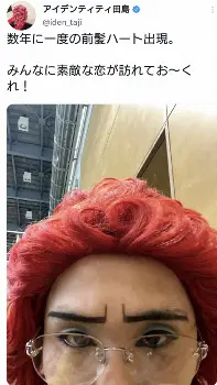 この日「数年に一度の前髪ハート出現」というつぶやきとともに顔のアップ写真を投稿した田島。写真には代名詞である赤いカツラにハートの形が出現した様子が写っていた。“幸運のハートマーク”の出現に田島は「みんなに素敵な恋が訪れてお~くれ!」と幸せを祈った。