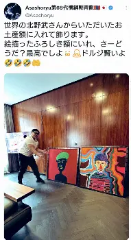 14日に自身のツイッターで憧れのたけしと対面を果たしたことを明かした元朝青龍。この日はたけしからお土産で貰った絵の写真を公開し「世界の北野武さんからいただいたお土産額に入れて飾ります」とつぶやいた。世界の巨匠からの贈り物に元朝青龍は「絵描ったふろしき額にいれ、さーどうだ?最高でしよ ドルジ賢いよ」(原文ママ)とかなり上機嫌だった。