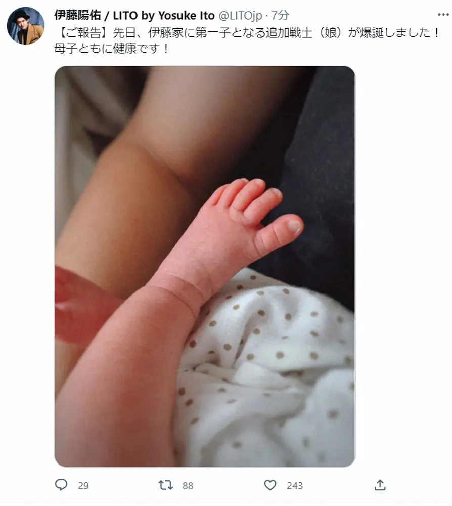 伊藤陽佑インスタグラム(@litosanjp)から “デカグリーン”伊藤陽佑、第1子誕生「追加戦士(娘)が爆誕しました!」5… ギャラリーで見る この記事のフォト 2022年10月24日の画像一覧 もっと見る 2022年10月24日の画像をもっと見る