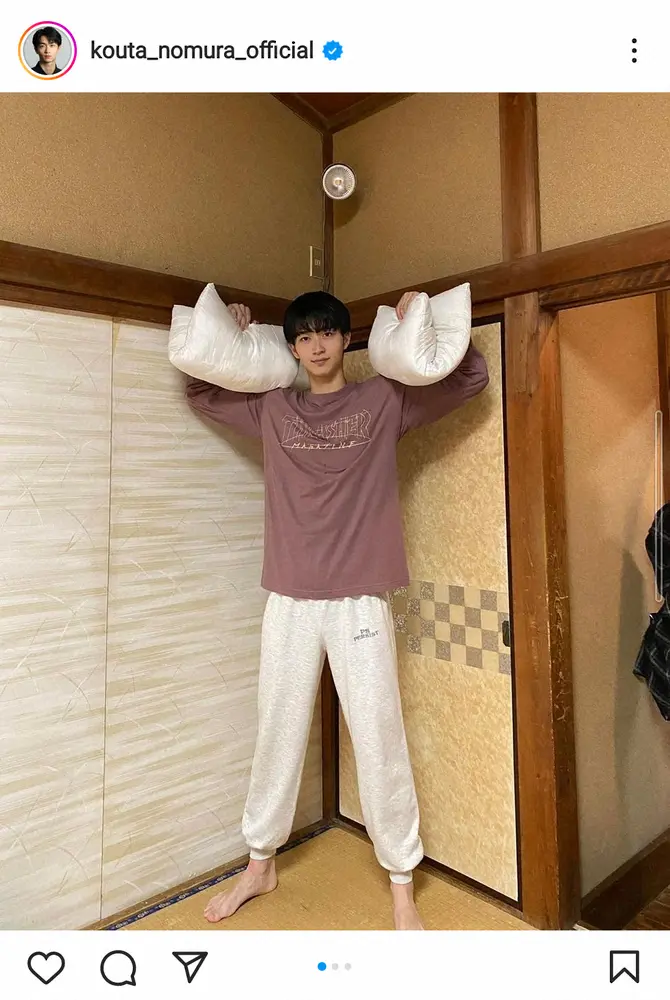 現在放送中のTBSドラマ「差出人は、誰ですか?」(月~木曜深夜0・40)に氏田誠二役で出演している野村は放送が3週目に入ったと記すと、ノーセットの髪形でロングTシャツ、スウェットパンツ姿で枕を両手に抱えたオフショットをアップ。「三週のどこかでノーセットの誠二君が見られるかも?!この日の撮影は色んな方から『誠二だよね??』と言われました」とつづった。