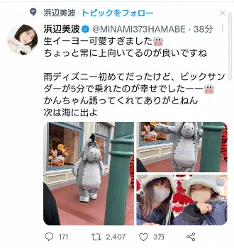 また、浜辺も自身のツイッターを更新し「雨ディズニー初めてだったけど、ビックサンダーが5分で乗れたのが幸せでしたーーかんちゃん誘ってくれてありがとねん 次は海に出よ」とつづった。