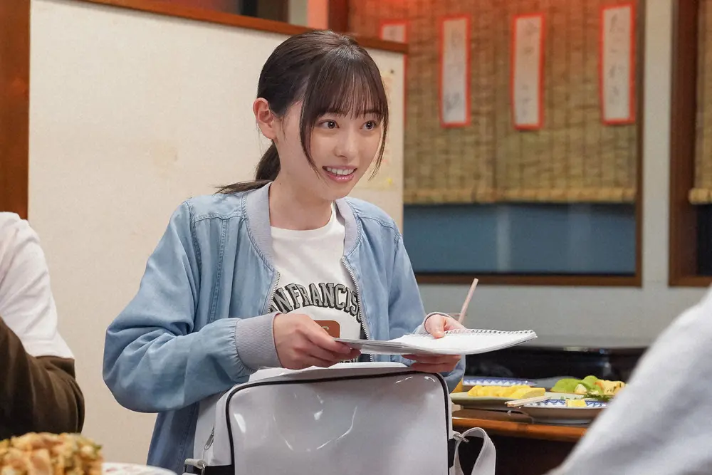 連続テレビ小説「舞いあがれ!」第19話。居酒屋にて。スケッチブックを刈谷に渡す舞(福原遥)(C)NHK