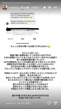 真野によると「ブロックしても新しいアカウントを作っての繰り返しです」といい「今回はフォロワーさんに対して何かしようとしてるみたいで 過去に、私の夫の友人に 私がしてもいないことをしていると書いてDMを送ったり 友人たちのコメント欄に私への誹謗中傷を書いたり ということが何度かあって 周りの方から心配されたことがあるので 流石にちょっと見過ごせないなぁと思い 今回はこうやって発信しようと思いました」とつづった。