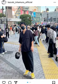 北村は「このところ寒くなりましたね。少し前まで半袖だったのに」とつづり、夏の服装で渋谷を訪れたときの写真をアップ。人ごみの仲、黒い上下に黄色のスニーカーと、スタイリッシュなファッションでたたずむ姿を公開した。