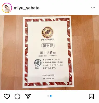お笑いコンビ「アルコ&ピース」の酒井健太(38)の妻で、フリーアナウンサー・矢端名結(みゆ、28)が28日、自身のインスタグラムを更新。「チョコレート検定」に合格したことを報告した。